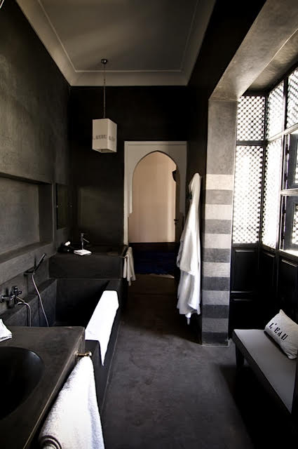 Sa salle de bain en tadelakt noir donne dans le Menzeh avec vue sur le patio et la piscine.